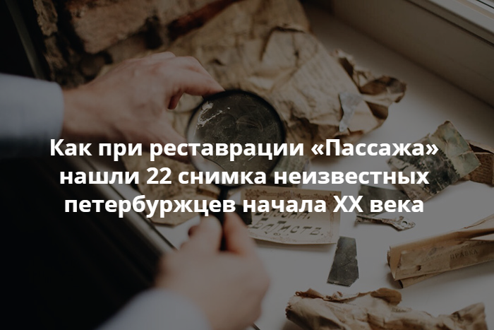 Во время реставрации под одним из залов «Пассажа» на Невском проспекте инженеры обнаружили подобие тайника. Там лежали 22 стеклянных негатива с портретами петербуржцев. Эксперты считают, что снимки сделали в 1919–1921 годах.