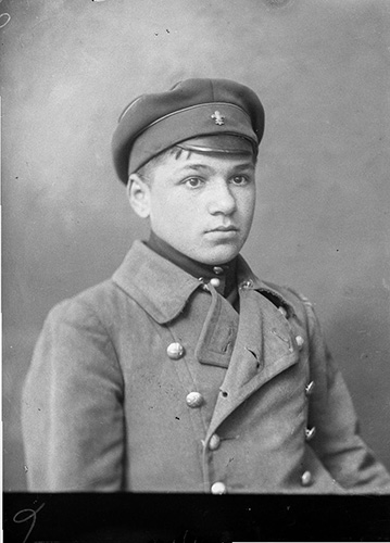 Учащийся среднего технического учебного заведения, 1917–1919 годы. Одет в шинель со споротыми петлицами, на воротнике от них остались «тени». Свинтил с фуражки жестяную имперскую арматуру, которую носили ученики гимназии, и прицепил к ней лилию Бурбонов. Скорее всего, мечтает стать военным офицером.