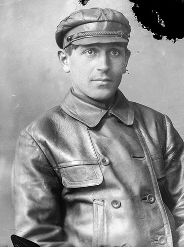 Молодой человек, начало 1920-х годов. Одет, скорее всего, в свой лучший выходной костюм — рубаху на манер военной, кожаную фуражку с щегольским ремешком и кожанку — дорогую, двубортную, с языками карманных клапанов. Одежда без пятен и дыр, хотя молодой человек из пролетариата.