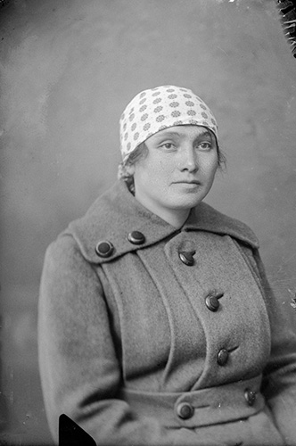Молодая рабочая, 1920–1923 годы. Девушка одета в выходное платье и теплое пальто с пестрой ситцевой косынкой, повязанной по-рабочему — на затылке. Не накрашена. Скорее всего, до революции имела низкое социальное положение.