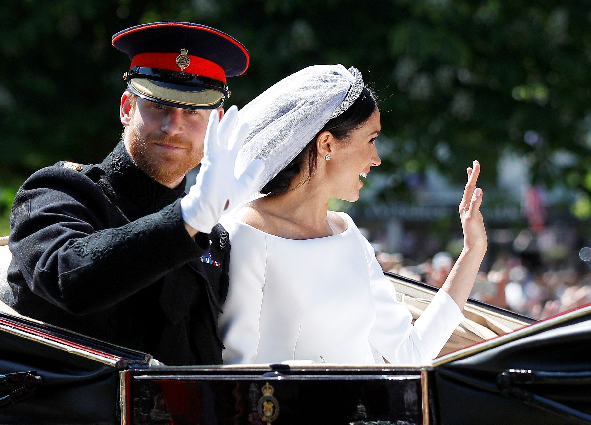 После часовой службы в церкви Св. Георгия, находящейся в Виндзорском замке, принц Гарри с женой совершили поездку по городу к замку. Она длилась примерно 25 минут, десятки тысяч горожан и приезжих приветствовали молодожёнов.