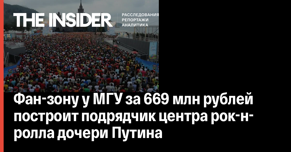 Фан-зону у МГУ к ЧМ-2018 по футболу за 669 миллионов рублей будет строить ООО «Магнум», которая уже выигрывала тендеры на реконструкцию «Лужников», строительство манежа для «Локомотива», центра акробатического рок-н-ролла Катерины Тихоновой, предполагаемой дочери Владимира Путина. Об этом пишет Znak.com.