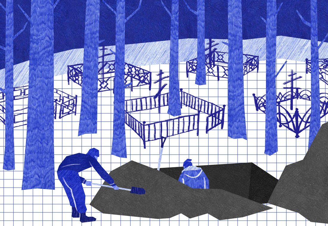“When the harsh frost hits, when it’s minus 40 outside, we have to get up and dig. In the pit, at a depth of about a meter [3.3 feet], it can actually get too hot — and that’s what saves us,” says 27-year-old Igor as he puts on a camouflage uniform covered in soot. He pulls on a balaclava, so the ash doesn’t reach his lungs. All this is necessary for his work: Igor is a gravedigger in one of the graveyards in Ust-Kut. Before he digs a grave, he has to burn enough lumber to warm the earth below — hence the ash. Digging alongside Igor is his mentee Nikita, the same 16-year-old who was indebted to a supervisor and for whose sake Mikhail and Sergey robbed stores.