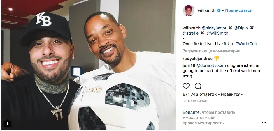Уилл Смит разместил на своей странице в Instagram совместное с Ники Джемом фото, сопровожденное хэштегом #WorldCup.