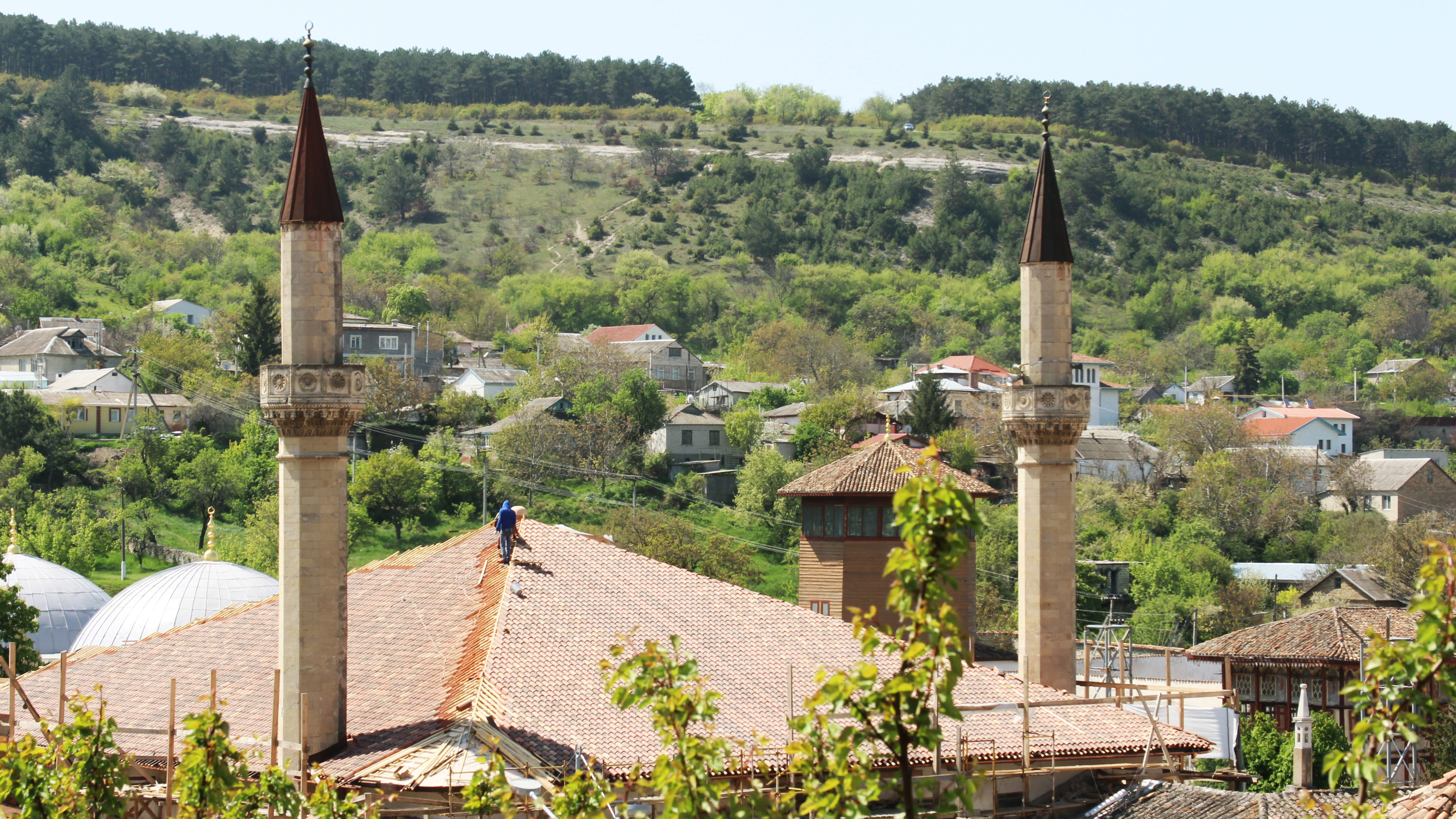 С Эльмаз мы встретились в кофейне, окна которой выходят прямо на Ханскую мечеть. С верхней точки очень хорошо видно, как строители (одна из экскурсоводов сказала нам, что во дворце сейчас работают именно строители, а не реставраторы) кладут новую черепицу. Звук строительных работ доносится и до нас. Каждый раз, услышав звук инструмента, девушка хмурится и предпочитает туда не смотреть.