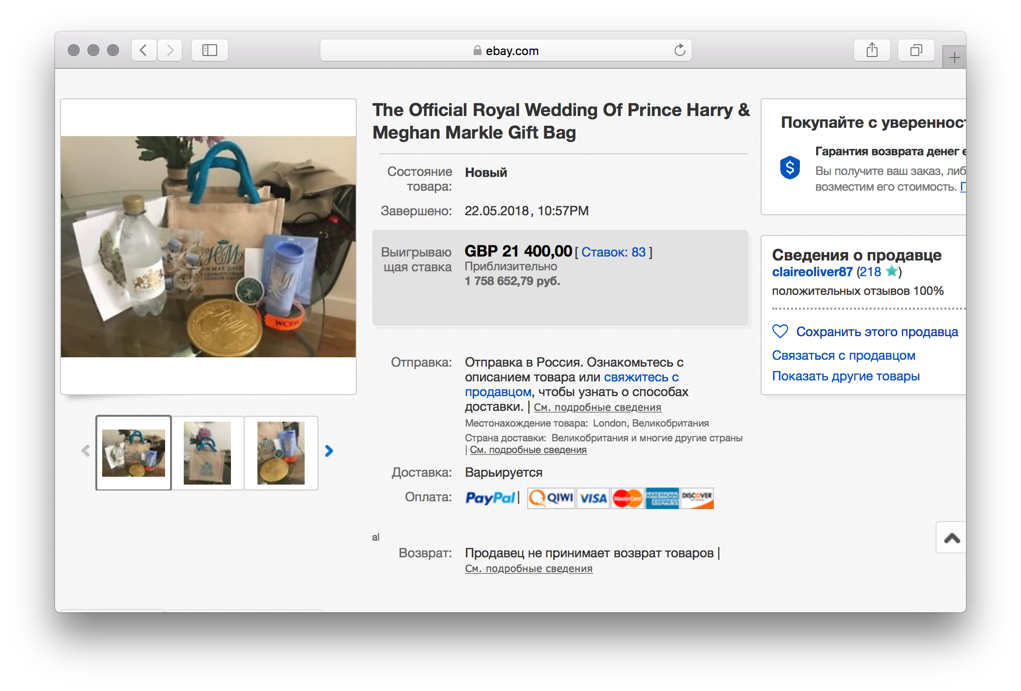 Спустя несколько дней после свадьбы Оливер решила продать на Ebay сувениры, которые королевская семья вручала гостям. В подарочном наборе были: