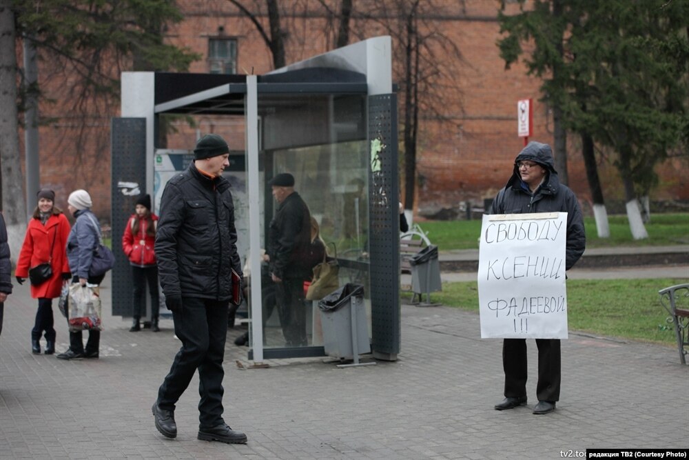 Пикитирующий держал плакат "Свободу Ксении Фадеевой!!!" Накануне, 26 мая, активисты призвали выйти на одиночные пикеты за освобождение Фадеевой из-под административного ареста, под который ее отправил 25 мая судья Вадим Типикин, сообщил портал "ТВ2".