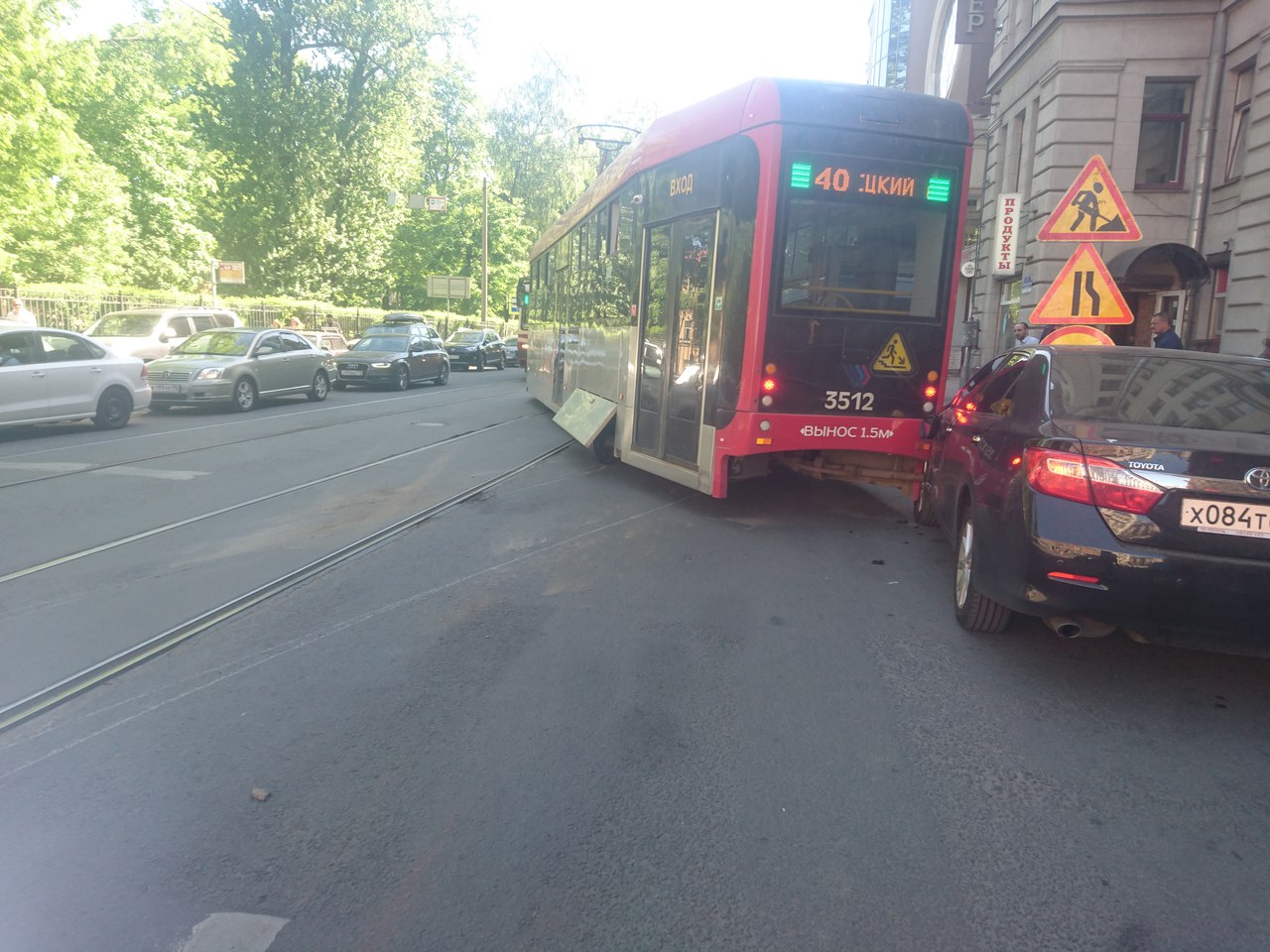 По данным «Фонтанки», трамвай снес ехавший в попутном направлении автомобиль и врезался в столб. По предварительной информации, у состава вывернуло колесную пару.