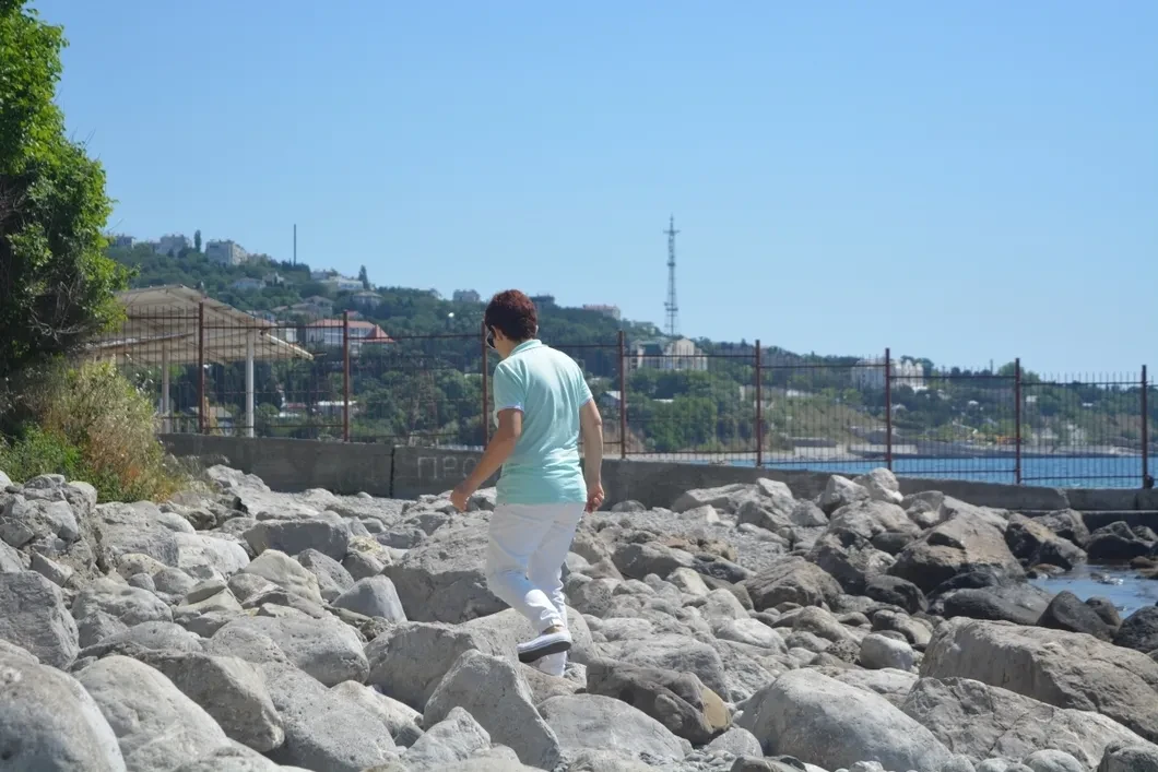 Ирина показывает мне благоустроенный пляж с мелкой галькой, куда жителям и гостям Симеиза, не остановившимся в санатории, проход воспрещен. Прямо по пирсу установлен высокий забор, с обратной стороны забора — валуны.