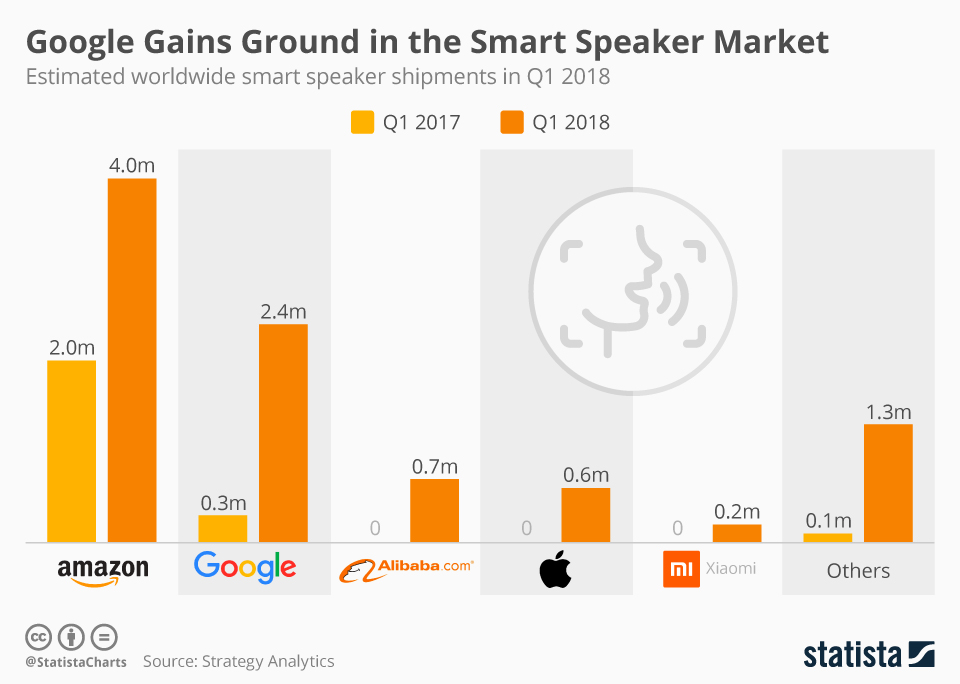 - В первом квартале 2018 года в мире было продано 9,2 млн умных колонок — это рост в 4 раза по сравнению с 2017 годом. В США они есть уже в каждом пятом доме, где проведен Wi-Fi. Google со своим Google Assistant стремительно догоняет по доле рынка Amazon, а в Китае в гонку уже включились Alibaba и Xiaomi.