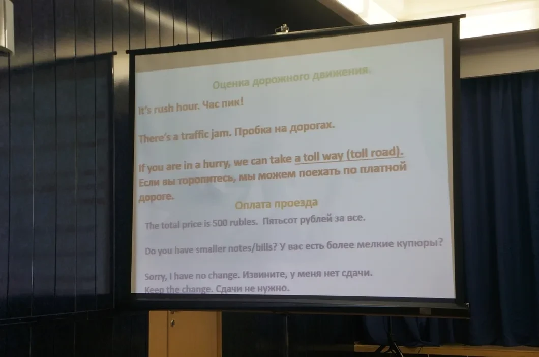Начали с первой страницы разговорника: приветствие, прощание, благодарность, извинение и обращение. Определили разницу между hello и you are welcome, excuse me и sorry. Нестройным хором повторили по-английски: «Желаю удачи вашей команде» и «Добро пожаловать в Москву».