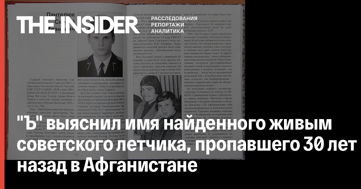 Обнаруженный живым советский летчик, который 30 лет назад пропал в Афганистане и с тех пор считался пропавшим без вести, - предположительно лейтенант Пантелюк Сергей Иванович, 1962 года рождения, сообщает «Коммерсант». По данным источников издания, в списках пропавших без вести в Афганистане за 1987 год значится только один военнослужащий ВВС.