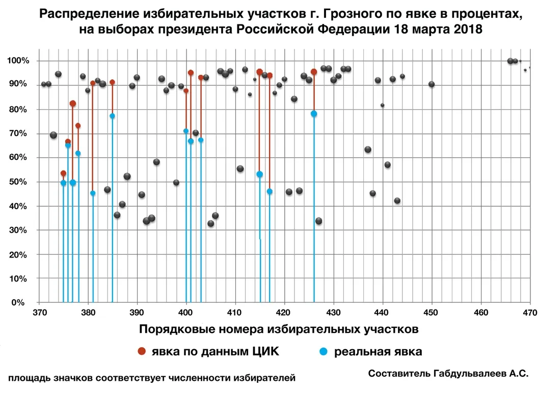 — Что меня больше всего поразило, так это повальная безграмотность председателей комиссий, полное пренебрежение установленным порядком подсчета голосов и повсеместное упрощение процедур, — говорит Габдульвалеев. Соотношение визуальной (зеленые точки) и официальной явки (красные точки) он изобразил в виде диаграммы, соединив для наглядности показатели.