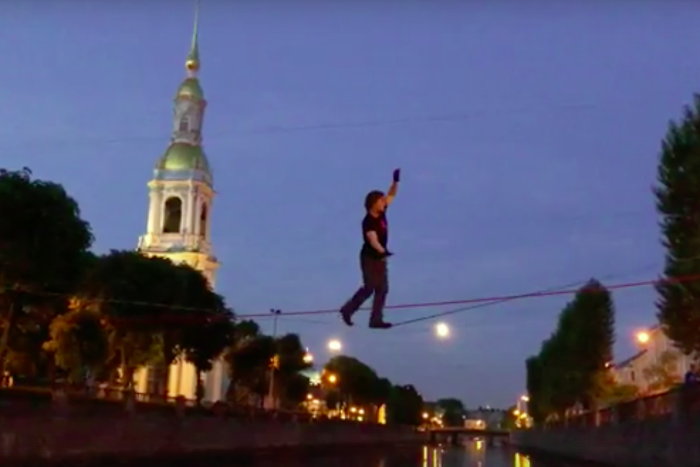 Петербуржец в субботу вечером перешел по тросу через Крюков канал. Видео прохода опубликовали в группе «Признавашки ДТП и ЧП».
