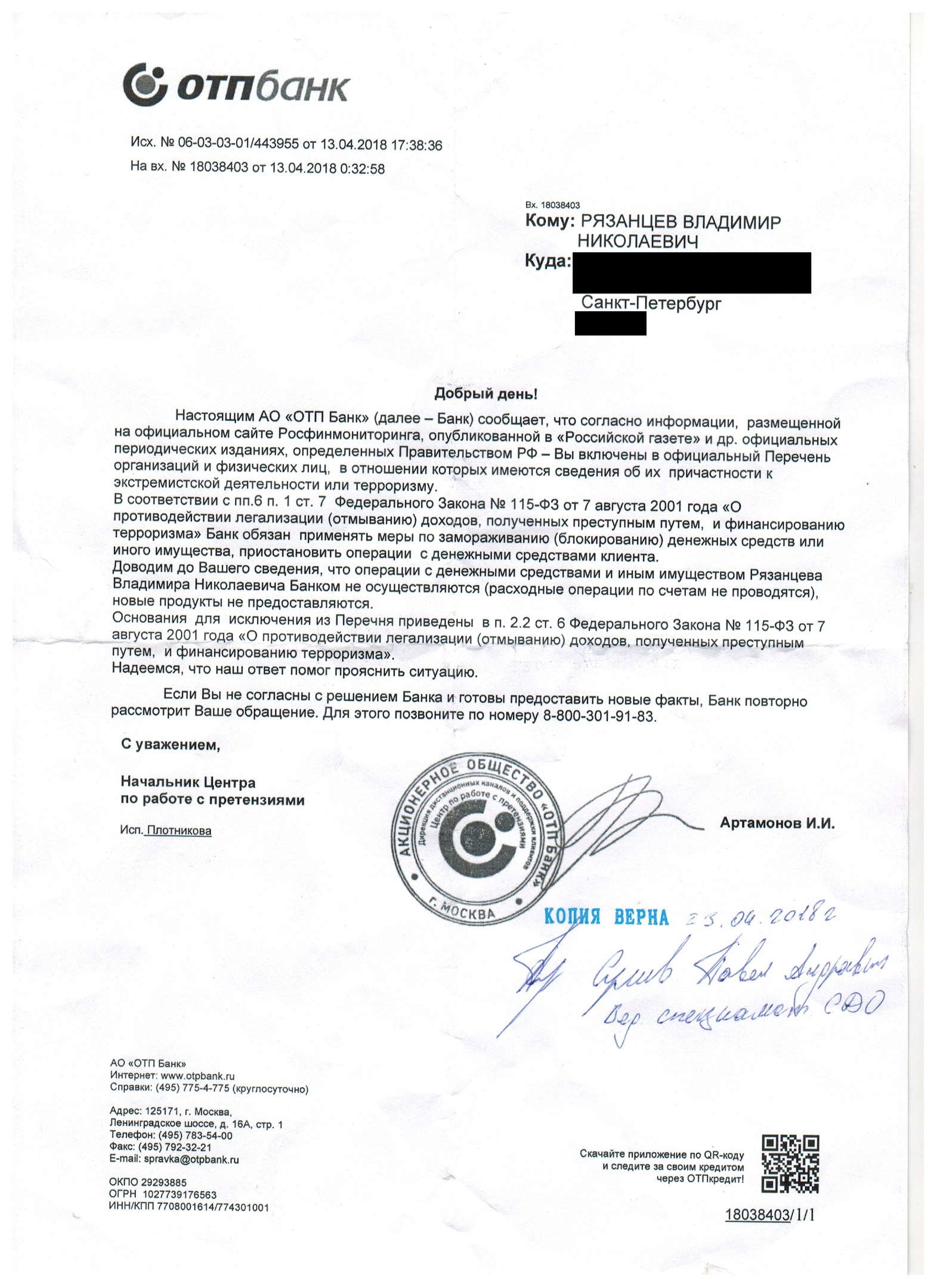 Хотя по делу еще не допросили свидетеля Григорука, в апреле Рязанцев узнал, что он включен в «список экстремистов и террористов Росфинмониторинга» (фамилия Рязанцева действительно упоминается в «Перечне организаций и физических лиц, в отношении которых имеются сведения об их причастности к экстремистской деятельности или терроризму» под номером 6113).