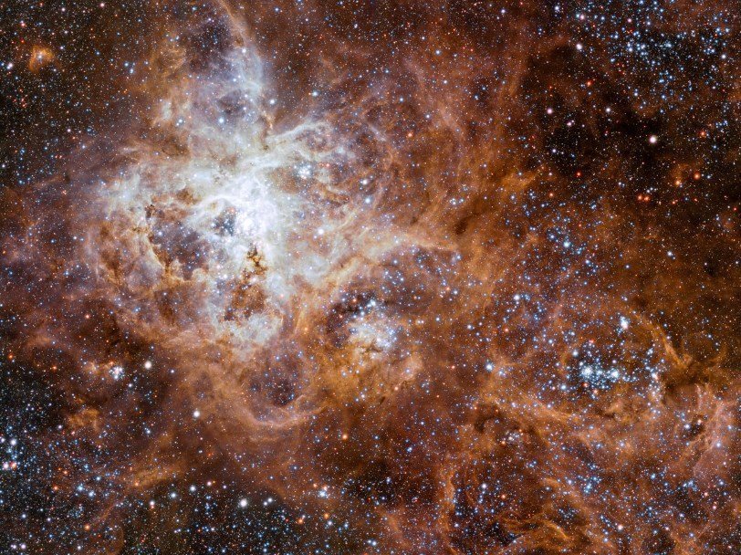 Туманность Тарантул в Большом Магеллановом Облаке ESO Телескопы ALMA и VLT Европейской Южной обсерватории (ESO) показали, что как галактики со вспышками звездообразования в ранней Вселенной, так и область звездообразования в близлежащей галактике содержат гораздо большую долю массивных звезд, чем их находится в более спокойных галактиках. Это открытие ставит под сомнение современные воззрения на эволюцию галактик, меняет наше понимание истории звездообразования во Вселенной и наши представления об образовании химических элементов. Об открытии рассказывает пресс-релиз ESO.