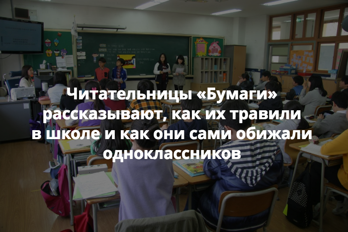 По просьбе «Бумаги» читатели рассказывают, как они пережили травлю в школьном возрасте и что думают о ней сейчас. Семь девушек вспоминают, как их травили одноклассники, что помогло им справиться с агрессией окружающих и как они сами обижали других учеников.