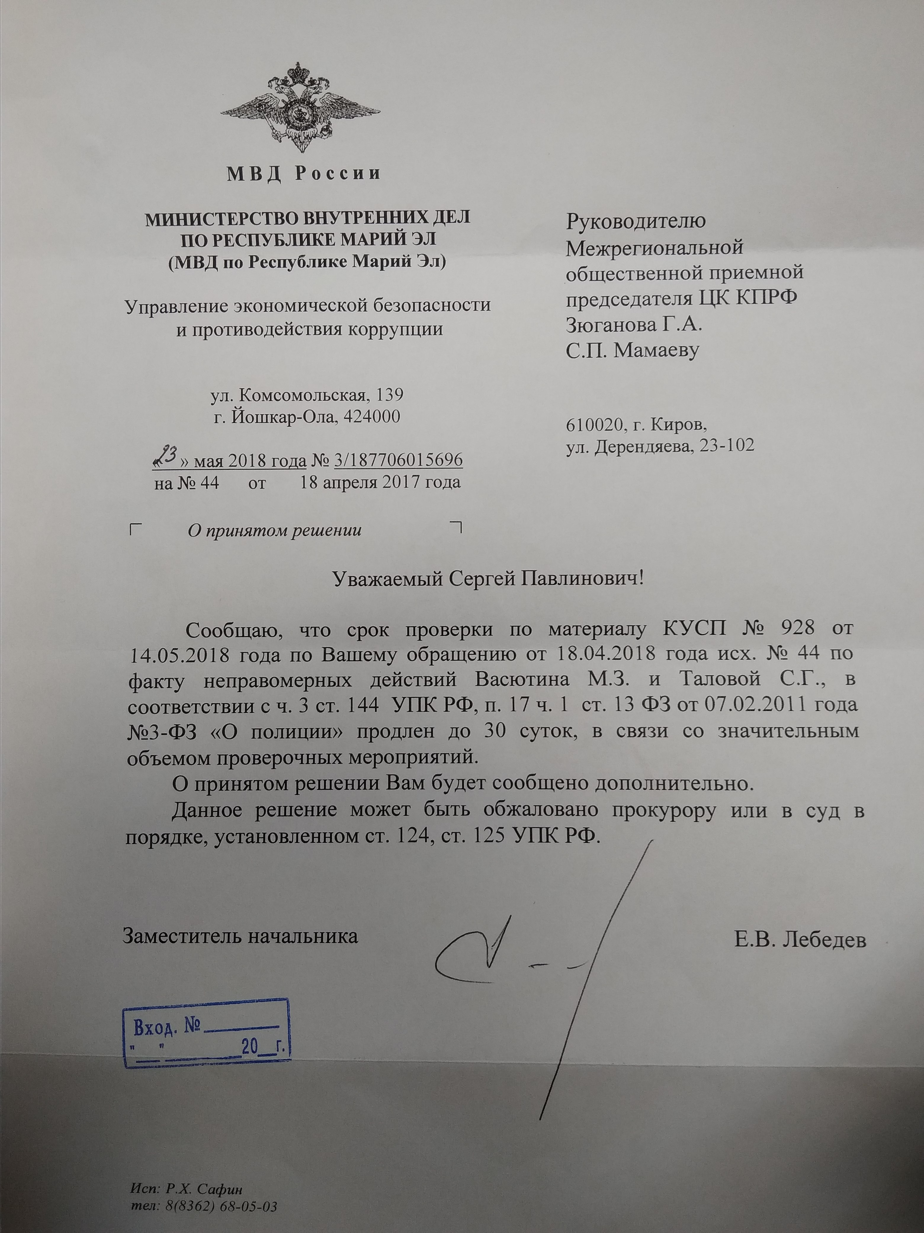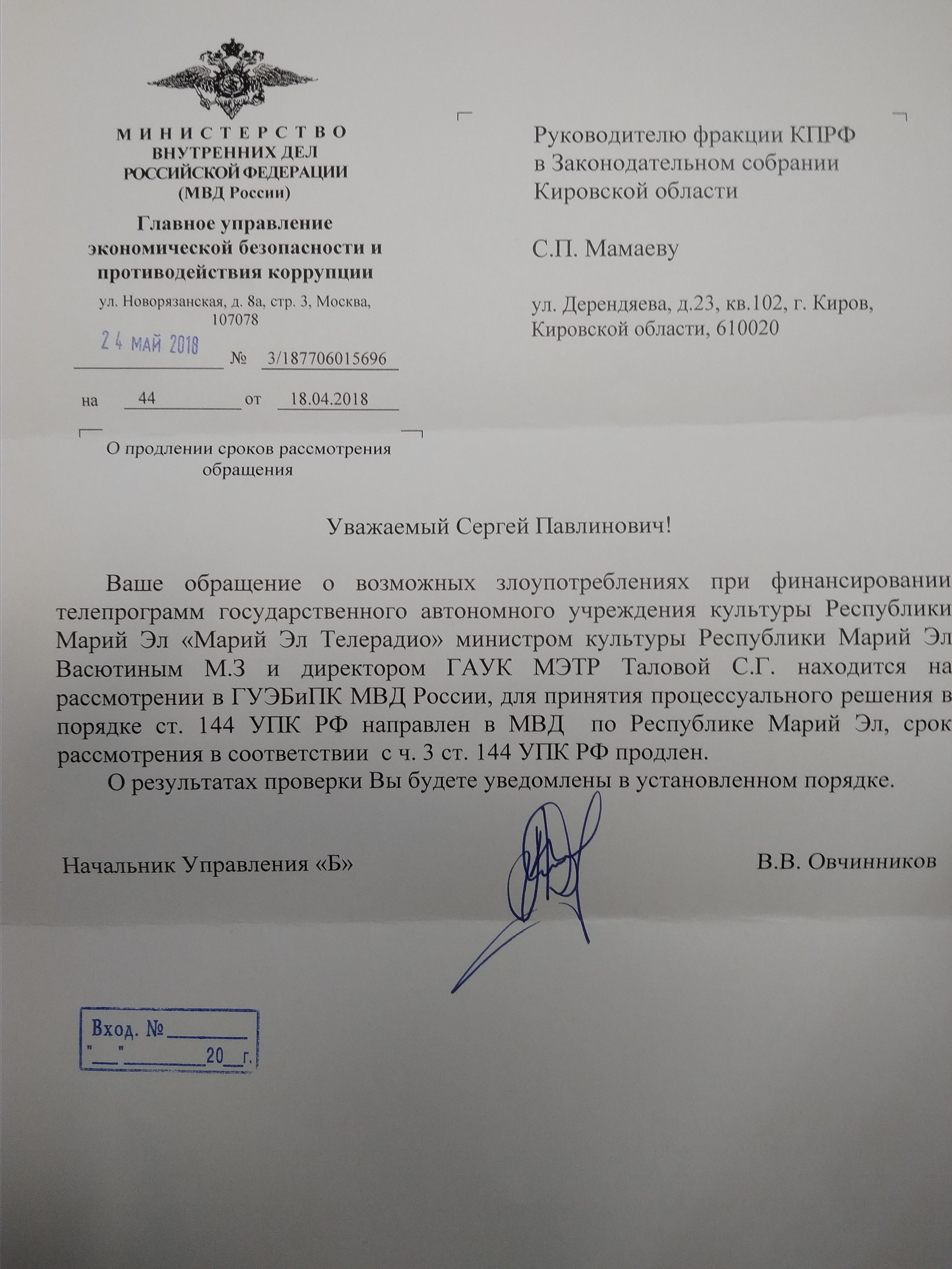 В связи с этим руководитель межрегиональной приемной Геннадия Зюганова Сергей Мамаев просил организовать проверку в отношении замглавы правительства Марий Эл Михаил Васютина и директора ГАУК МЭТР Светланы Таловой. Запросы были отправлены в Генпрокуратуру и Министерство внутренних дел России. На днях пришел ответ из МВД России, что для принятия процессуального решения по вопросу возбуждения уголовного дела, оперативникам УБЭП нужно еще время.