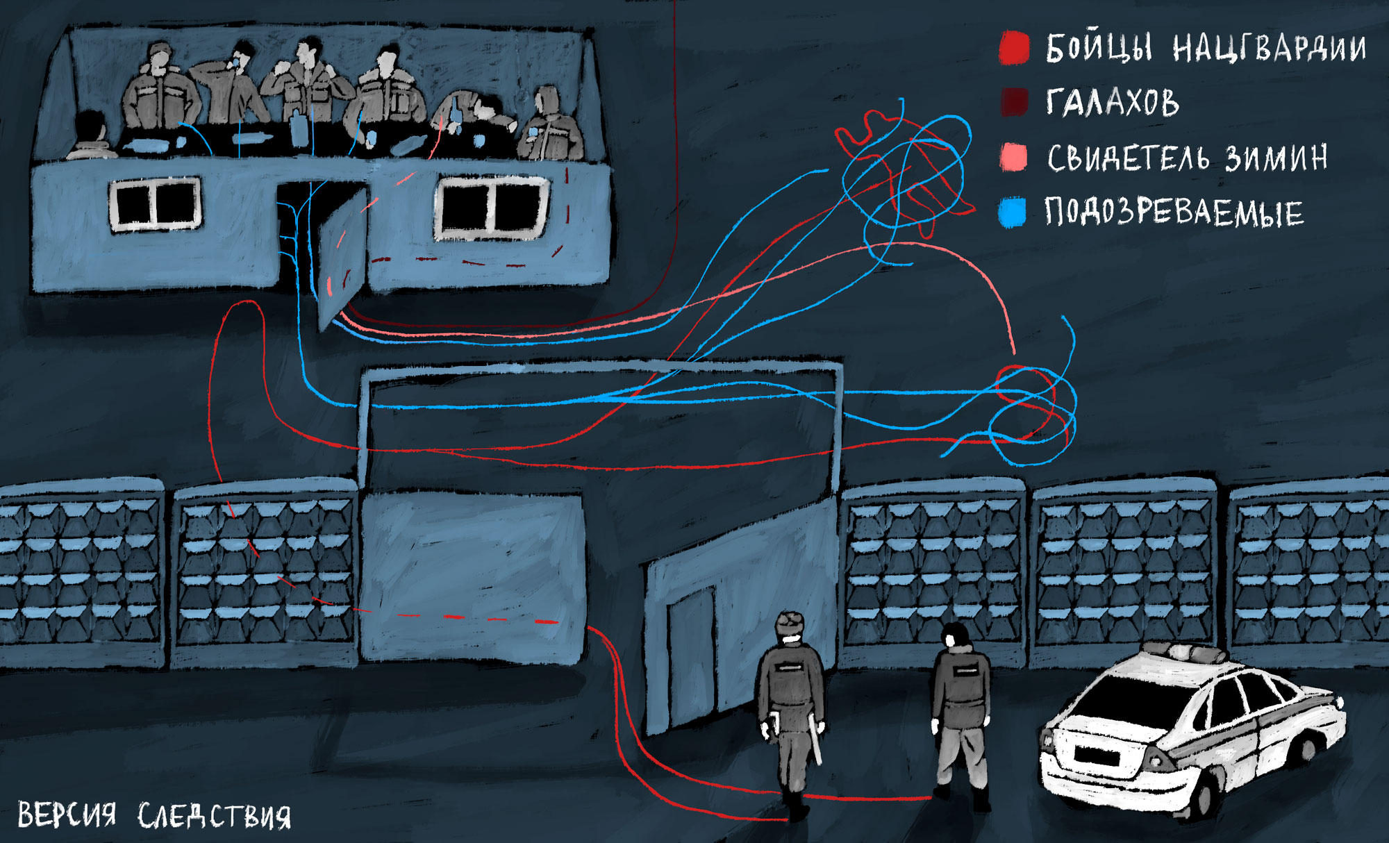 Пока рабочие пили, по вызову сотрудницы «Дикси» приехали нацгвардейцы Иван Холмогоров и Виктор Глебов. У каждого из них был пистолет Макарова и бронежилет, а у Холмогорова — еще и пистолет-пулемет «Кедр». В супермаркете им продемонстрировали запись с камеры наблюдения, продавщица показала, в какую сторону отправились грабители. Силовики поехали к стройке. Оставив машину на въезде, они спросили охранника, есть ли кто-нибудь внутри — тот ответил, что только электрик. Напарники все же стали проверять территорию, а услышав голоса из дальней бытовки, решили посмотреть, кто внутри.