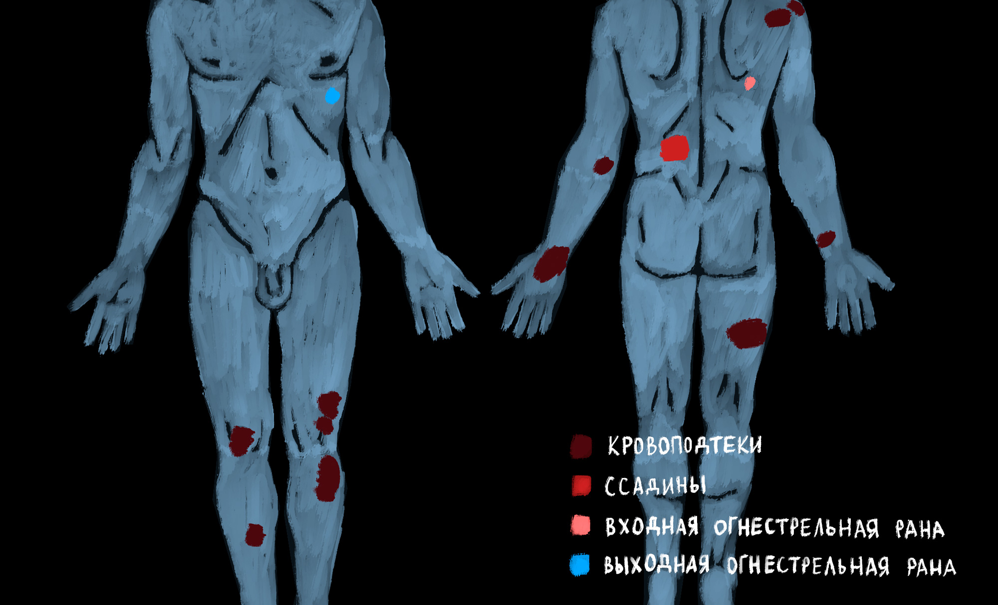 Меньше всех повезло Артему Бойко. Он говорит, что после потасовки пошел в сторону деревни и забрался под первый попавшийся дом, где надеялся переждать спецоперацию. «Пришли сотрудники, фонариком посветили, я вылез. Надели наручники, минут 40 били. Спрашивали, где пистолет, я говорю — я пистолет никакой не видел. «Не ври, сейчас мы тебя убьем», — отвечают. Прострелили ногу, там три пули. Они меня подняли, я весь в крови был и упал. В машину, как мешок цемента, затащили, пристегнули к ручке, привезли на место преступления и выкинули. А дальше я ничего не помню, я что-то орал от боли, по голове ударили с ноги, и я выключился. Проснулся уже в скорой», — говорил он в суде через полтора года после задержания.