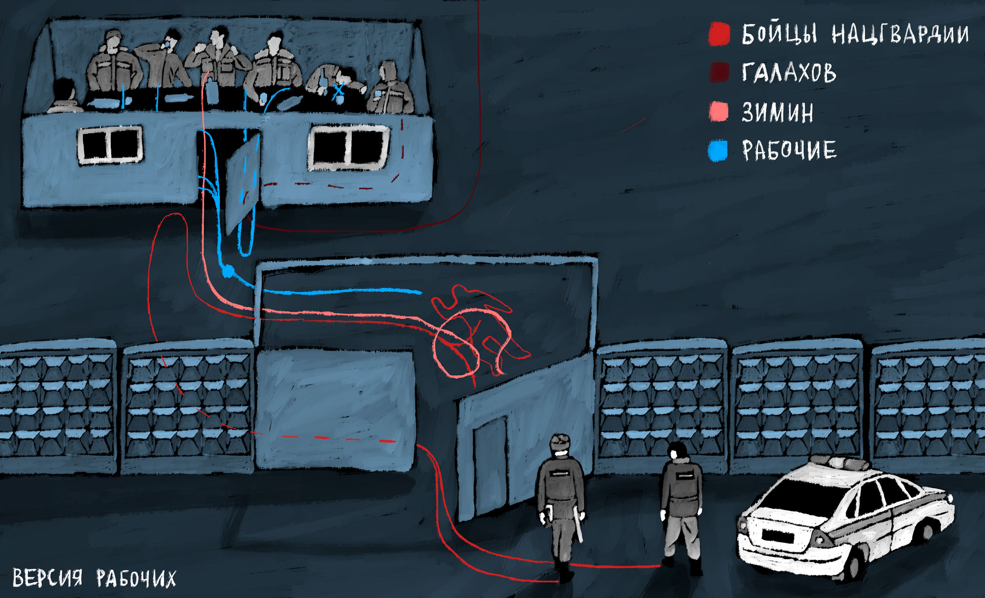 Поднявшись из-за стола, Евгений Сазонов достал из барсетки два паспорта — свой и Дениса Бойко — и отдал их кому-то из силовиков. По воспоминаниям рабочих, один из сотрудников начал снимать интерьер бытовки и ее обитателей на телефон — тем это не понравилось. Обстановка начала накаляться, силовики решили, что безопасней будет выйти из тесного помещения на улицу. Следом за ними отправились несколько монтажников.