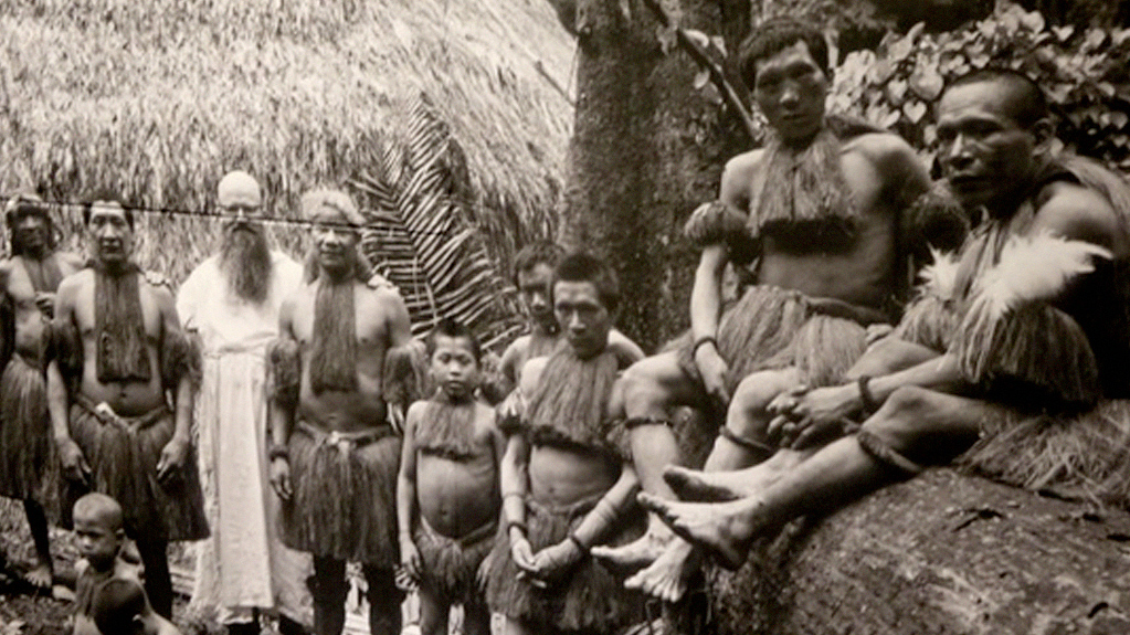 Достав из запасников картины и ритуальные предметы, музей рассказывает параллельную историю. Не про таинственные племена в джунглях, не про неведомых богов. Индейский колорит был фоном для центральной фигуры выставки. На огромной фотографии центрального стенда – высокий, бородатый, упитанный мужчина, словно собирательный образ, европейская цивилизация. Великий белый проповедник, принесший невежественным народам высшие знания, управлявший аборигенами для их же собственного блага... В очках, в белой рясе, всезнающий и спокойный, он запечатлен на пике духовной власти в окружении десятка благодарных темнокожих аборигенов.