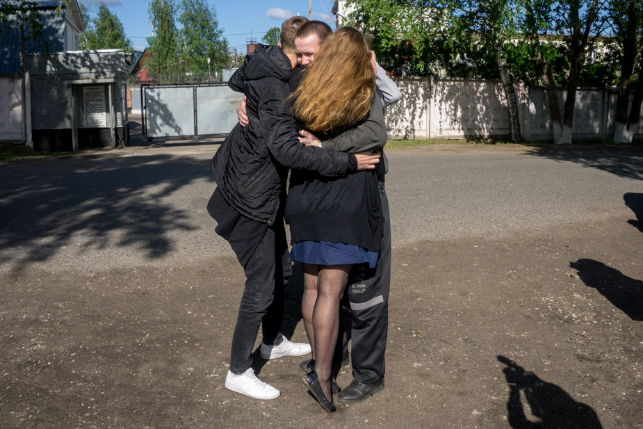 После адвокатов к Вахапову приехала жена с детьми. Старшему сыну Вахапова уже 16 лет, он, обняв, поднимает маму с папой над землей. Младшему — 14.