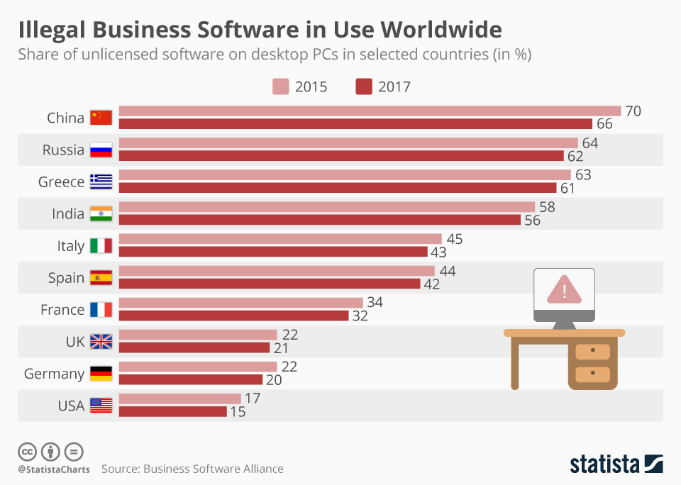Нелицензионное программное обеспечение пользуется популярностью у бизнеса по всему миру. Согласно данным американской компании Business Software Alliance, в 2017 году лидером по числу пиратского ПО на корпоративных компьютерах стал Китай, где без лицензии использовалось около 66% установленного софта. Примечательно, что вторую строчку в рейтинге стран, где бизнес чаще всего прибегает к установке пиратского ПО, заняла Россия (доля нелицензионного ПО составляла 62%). Самый низкий уровень отмечен в США – 15%, но даже этот показатель представлял собой потерю $8,6 млрд на рынке лицензионного программного обеспечения.