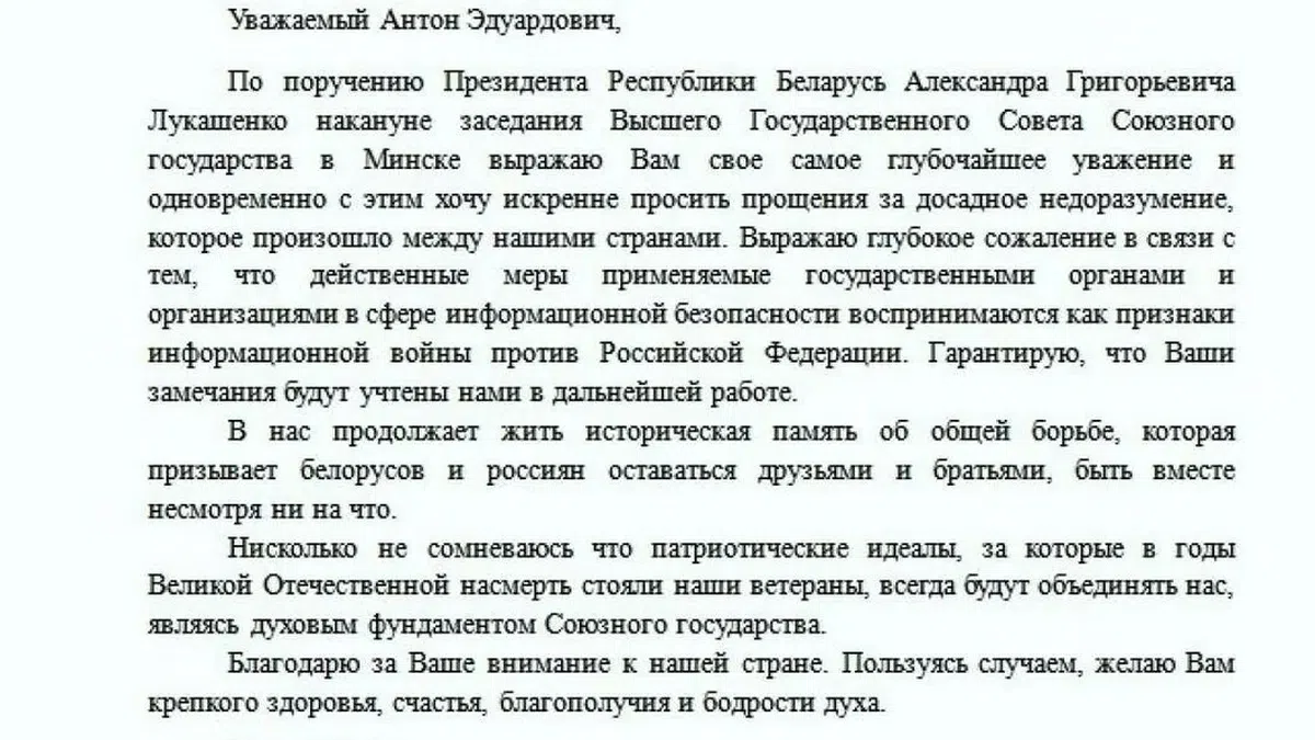 В твиттере первого заместителя главы Администрации президента Максима Рыженкова появилось фото письма на имя главы Администрации президента России Антона Вайно, в котором «от имени президента Беларуси Александра Лукашенко высказываются извинения российским коллегам за предпринятые нами меры против Российской Федерации в области информационной безопасности». Рыженков заявил, что его взломали, а такого письма не существует. Об этом сообщает Еврорадио.