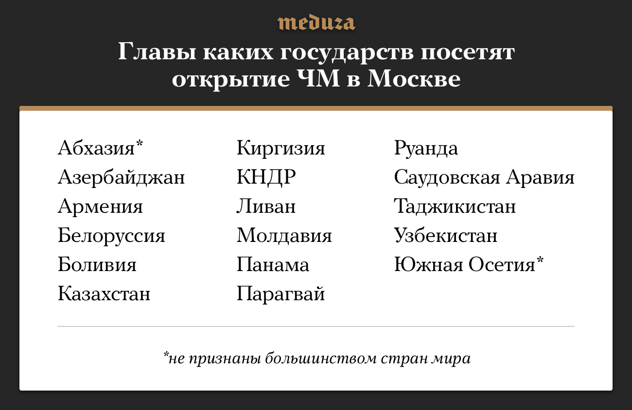 Пресс-секретарь президента России Дмитрий Песков назвал журналистам 17 стран, главы которых посетят церемонию открытия чемпионата мира по футболу 14 июня на стадионе «Лужники» в Москве. Список в основном состоит из стран СНГ и Латинской Америки. Кроме того, в нем присутствуют два государства, не признанные большинством стран — Абхазия и Южная Осетия. КНДР будет представлять председатель президиума Верховного народного собрания Ким Ён Нам.