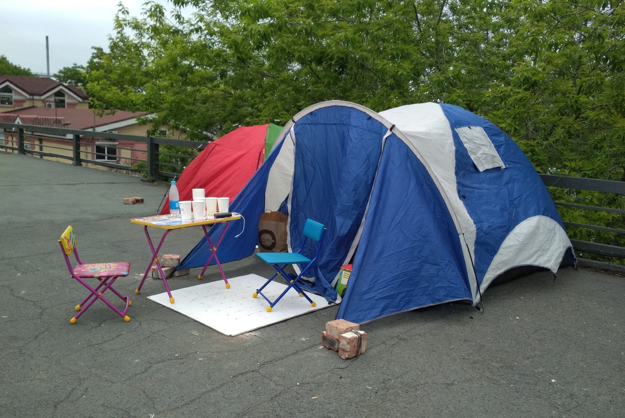 В самом центре Владивостока, на площади Борцов за власть Советов на Дальнем Востоке, стоят две туристические палатки — двуспальная красно-зеленая и трехспальная синяя. Туристы из Китая радостно фотографируют их — еще одна достопримечательность.