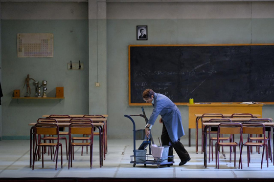 — Конечно, школьный класс тут не случайно. Мы же говорим об истории. Этот спектакль и есть урок истории. И она не просто убирается — она освобождает класс от всего, от мебели и так далее, высвобождает пространство для новой, идеальной истории. Утверждая себя как человека. И не случайно она буквально вгрызается в пол, роет там яму — так в пространстве появляется пересекающая его вертикаль. Для меня этот образ непосредственно связан с историческим измерением. Но каждый зритель увидит свое. Спектакль ведь мне не принадлежит. Я просто что-то бросаю, а зритель пусть ловит как хочет. Сердцем, жизнью, ранами.