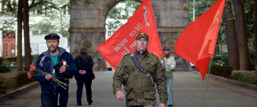 Как фиксация современной ритуальной практики «День Победы» сконструирован с математической точностью. Он открывается сценой репетиции почетного караула. Юноши, одетые в парадную форму, маршируют, а их неловкие, непрофессиональные движения дают понять, насколько они далеки от военной службы. Позже этих ребят мы увидим на торжественном мероприятии в парке. И опять же повторится их неловкость, но в этот раз она уже будет даже слегка комичной. И таких полукомичных эффектов в фильме немало: две собачки с флагами Новороссии и эмблемой спецназа везут маленькую тележку с портретом Сталина; чья-то спина в кадре в кожаной куртке с надписью Biker Petrukhin; земля, привезенная из Брестской крепости, которую никто не хочет брать; танец под песню «Калинка», плавно превращающийся в лезгинку; ребенок, отказывающийся надевать военную форму; коллективный снимок всех флагов бывшего СССР, куда почему-то затесался флаг современной Украины; закадровый разговор мужчин об особой славянской нравственности с необходимой нецензурной лексикой… Но все эти вещи именно не комичны, а полукомичны. Они не акцентируются, а являются фоном. Это своеобразные отклонения от порядка, которые как раз и высвечивают то, что ритуал потерял свое содержание и даже свои мифологические корни.
