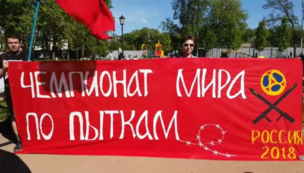 Sotavision / YouTube An anti-torture protest in St. Petersburg in response to allegations in the “Penza case.” May 20, 2018. Sign spoofs Russia's hosting of the 2018 FIFA World Cup, reading, “World Championship in Torture.”