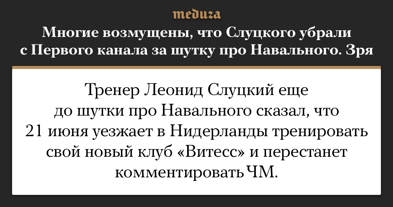 17 июня Тренер Леонид Слуцкий комментировал матч Германии с Мексикой и пошутил в эфире Первого канала про политика Алексея Навального. 19 июня многие СМИ написали о том, что Слуцкий больше не будет комментировать ЧМ и в заголовках напомнили о его шутке. Но еще 14 июня Слуцкий предупреждал, что 21-го уедет в Нидерланды.