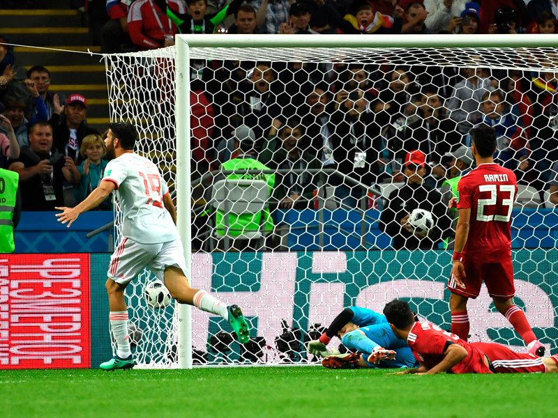 Владение мячом испанцев в первом тайме переваливало за 80%, но их соперник уверенно сдерживал натиск. В голевой атаке на 54-й минуте мяч курьезно влетел в сетку рикошетом от ноги Диего Косты, которого пытался накрыть центральный защитник Джаляль Хоссейни.
