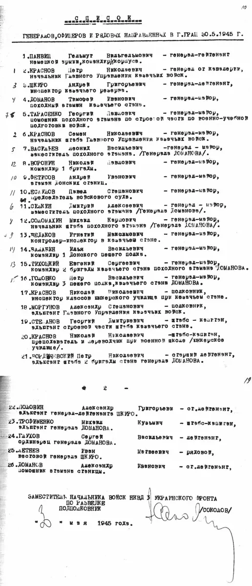 Здесь, в Казакии, они узнавали о переменах своего статуса. В феврале 1945 года их вывели из состава вермахта и переподчинили СС4. В апреле реорганизовали сам Казачий cтан, ставший Отдельным казачьим корпусом под командованием походного атамана генерал-майора Доманова5. А в конце апреля добавили еще одну командную инстанцию — генерала Власова (самого Власова и его РОА эмигрантская казачья головка недолюбливала).