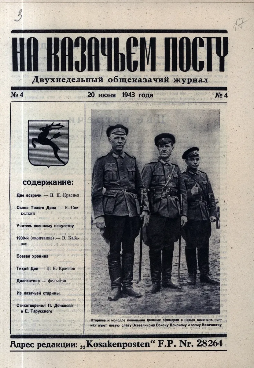 До собственно казачьих земель в СССР — Нижнего Дона — вермахт добрался на втором году войны — летом 1942 года. И сразу же приступил к формированию казачьих частей. В октябре 1942 года на Казачьем сходе в Новочеркасске — исторической столице Области Войска Донского — возрождается само Войско Донское и избирается его штаб. Атаманом становится Сергей Васильевич Павлов (1896–1944), скромный инженер на паровозостроительном заводе в Новочеркасске и бывший полковник царской армии.