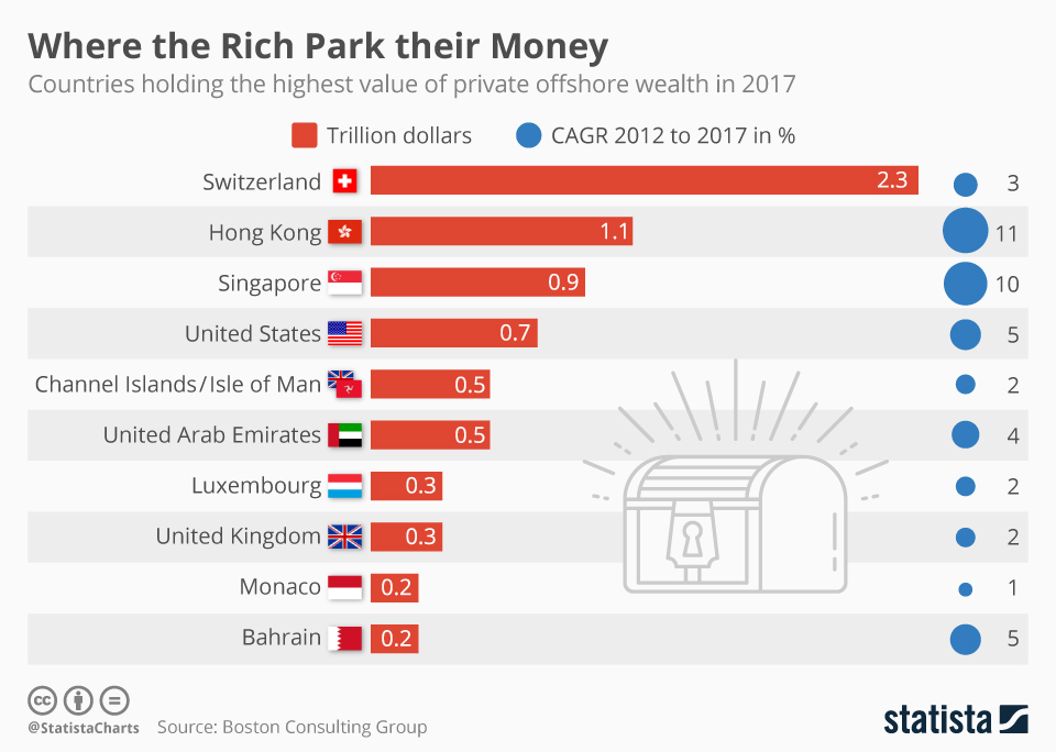 - А вот страны, где богатейшие граждане мира предпочитают хранить свои деньги — и России среди них, конечно, нет: