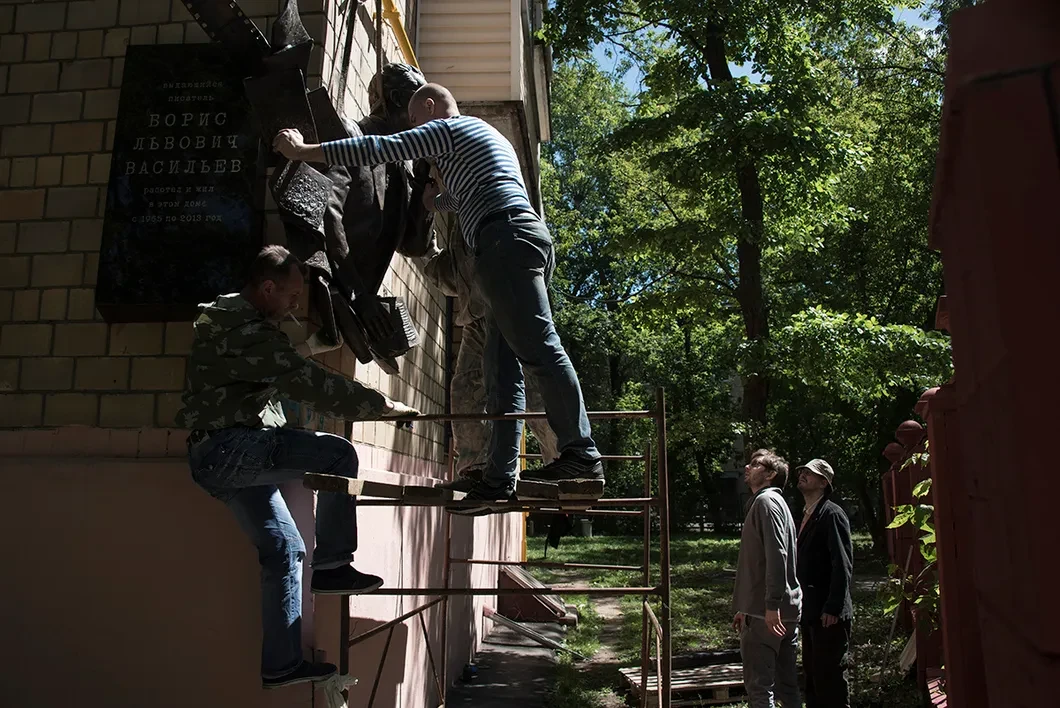 Тихие переулки в районе метро «Аэропорт». Дом 5Б по улице Часовая. Если будете проходить мимо, обратите внимание: человек в очках со строгим лицом и сигаретой в руке на мемориальной доске — писатель Борис Васильев, автор книг «А зори здесь тихие» и «Завтра был война». Автор доски – скульптор Иван Балашов. Он же делал доску памяти Анны Политковской на здании, где находится наша редакция в Потаповском. Иван Балашов работал не только по фотографиям и видео, но и по воспоминаниям родственников писателя.