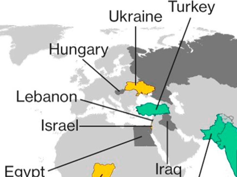 Карта иллюстрирует ситуацию с выборами в странах с развивающейся экономикой. Зеленым цветом обозначены государства, в которых должны пройти выборы в 2018 году, желтым - в 2019-м, а темно-серым цветом обозначены страны, где выборы уже прошли. Украина на карте окрашена в желтый цвет, Россия - в темно-серый. А Крым обозначен светло-серым цветом, передает РБК.