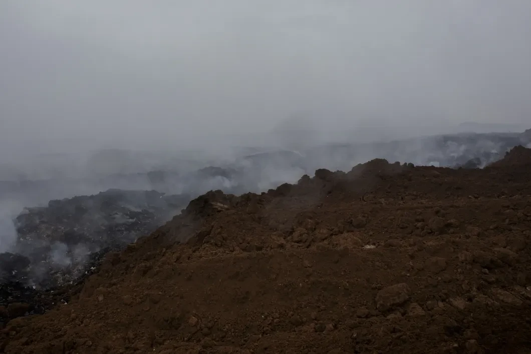 Низина у поворота на полигон затянута дымом. Дорога из щебенки упирается в мусорное плато. Начинается дождь, но такой объем мусора он не промочит. Гора сплошь курится дымками. По склону забираются оранжевые и синие грузовики. За каждой машиной тянется рыжее облако — грунт, собранный для тушения, выдувает из открытых кузовов. Ветер рвет блокнот из рук, но не уносит запах: гнилью здесь воняет еще сильнее, чем на Гуселке. Это действующая свалка, отходы сюда возили до последнего, даже когда уже начало гореть.
