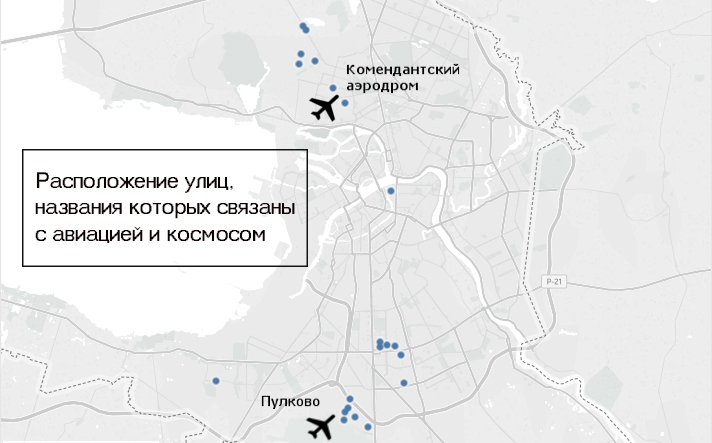 Студентки также нанесли тематические группы топонимов на карту. Выяснилось, что «культурные» улицы сосредоточены на севере города и в центре, большинство советских названий получили улицы на юге Петербурга, а топонимы на тему авиации и космоса оказались на окраинах города.