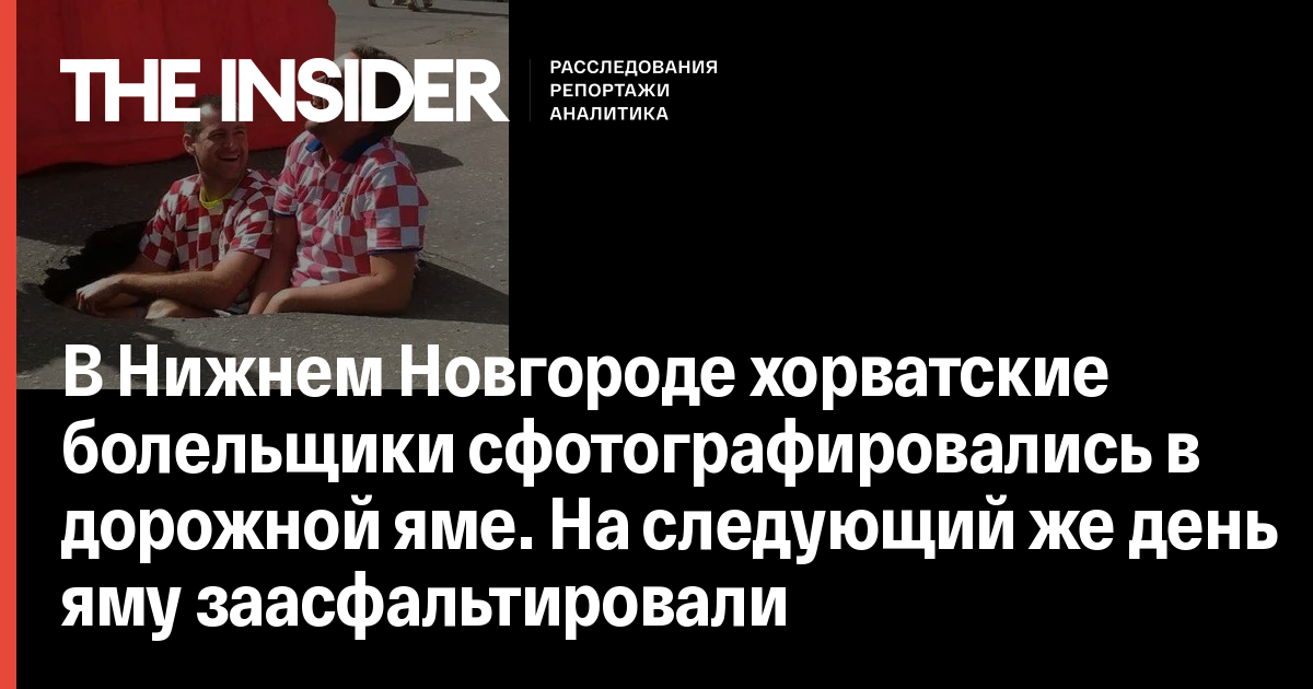 Болельщики хорватской сборной разместили в соцсетях фотографию, на которой они стоят в яме более метра глубиной посреди одной из дорог в Нижнем Новгороде. На следующий же день рабочие заасфальтировали яму. Об этом сообщает ТАСС со ссылкой на пресс-службу «Теплоэнерго».