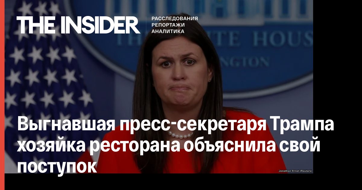 Пресс-секретаря Белого дома Сару Сандерс попросили покинуть ресторан Red Hen в Вирджинии, поскольку она работает на «бесчеловечную и неэтичную» администрацию президента США Дональда Трампа, защищая его «жесточайшую политику». Так владелица заведения Стефани Уилкинсон объяснила свою позицию в интервью The Washington Post.
