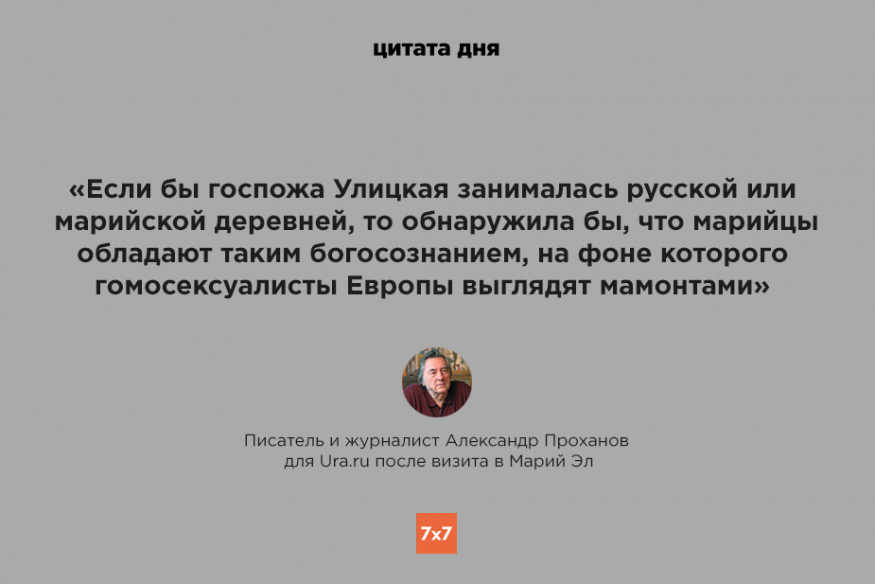 Известный политик, писатель и публицист Александр Проханов побывал в Марий Эл. Он встретился с главой республики Александром Евстифеевым, провел круглый стол по общественно-политической ситуации в регионе, посетил галерею и марийскую священную рощу.