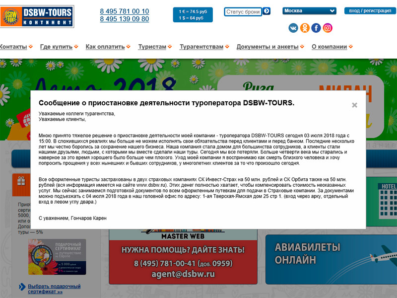 На туристическом рынке России новый крупный крах: о своем уходе объявил один из старейших туроператоров страны - DSBW Tours, начавший работу в 1991 году. Об этом, как пишет газета "Коммерсант", в своем аккаунте в Facebook сообщил собственник компании Карен Гончаров. По его словам, компания больше не может исполнять свои обязательства перед клиентами и банком.