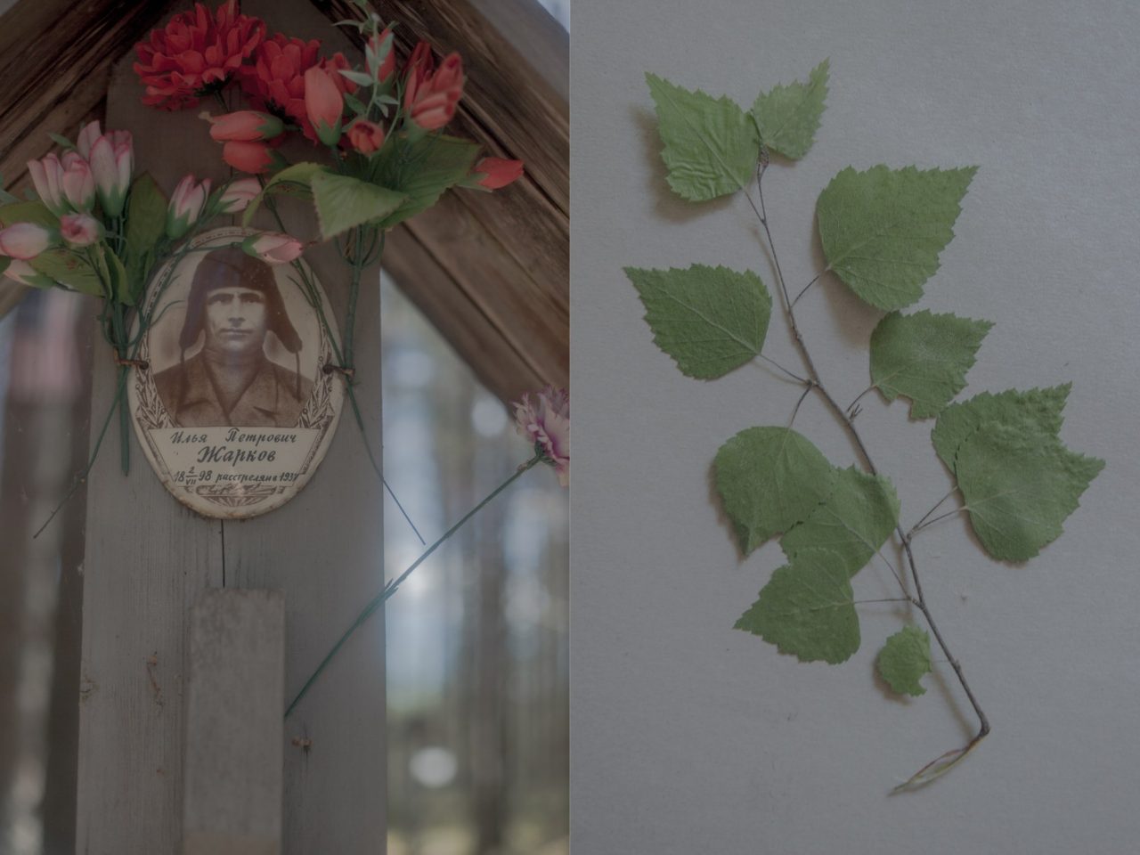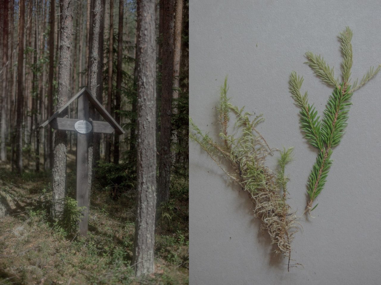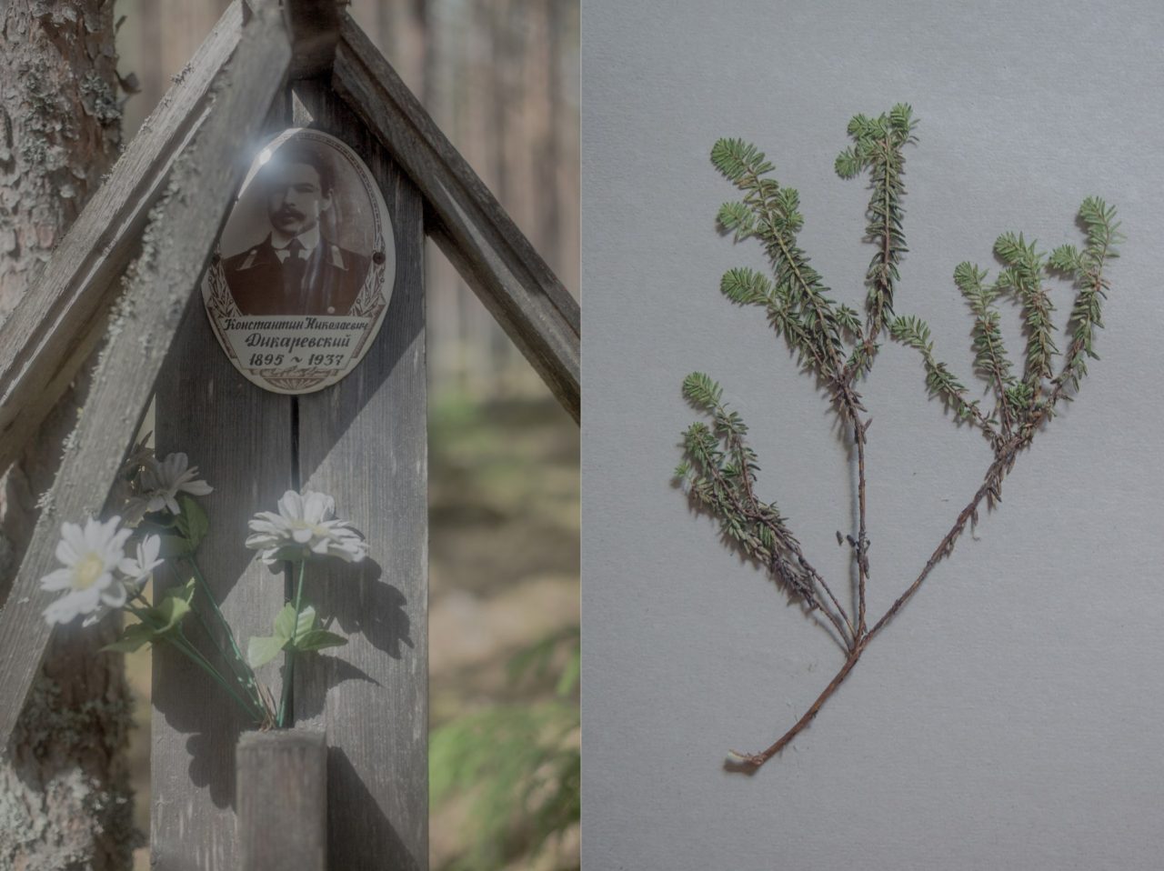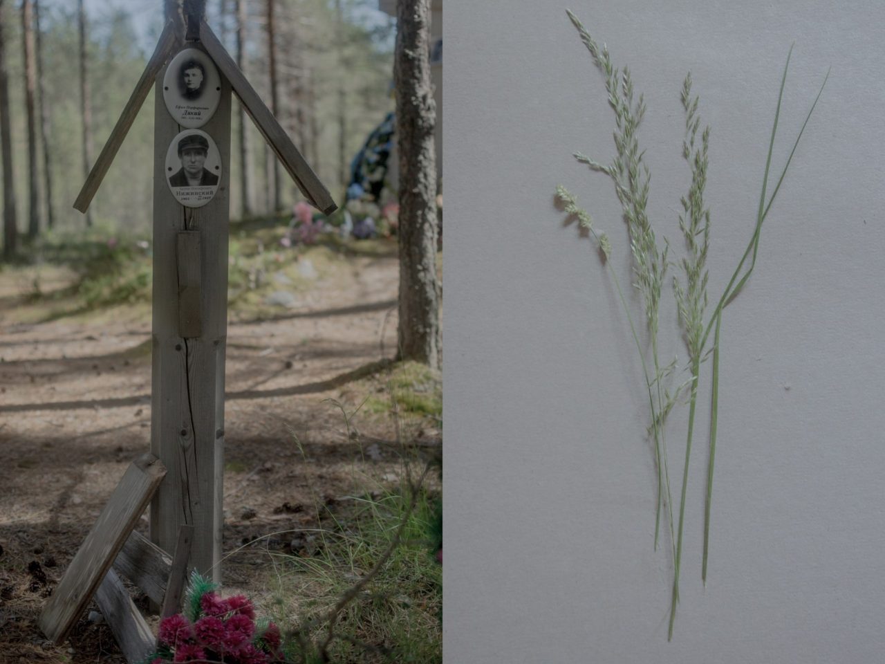 Урочище Сандармох. Слева: столб-голубец (распространенный на Севере вид памятного знака) Федора Павловича Багрова (1895—1937). Справа: растения, выросшие у поклонного креста