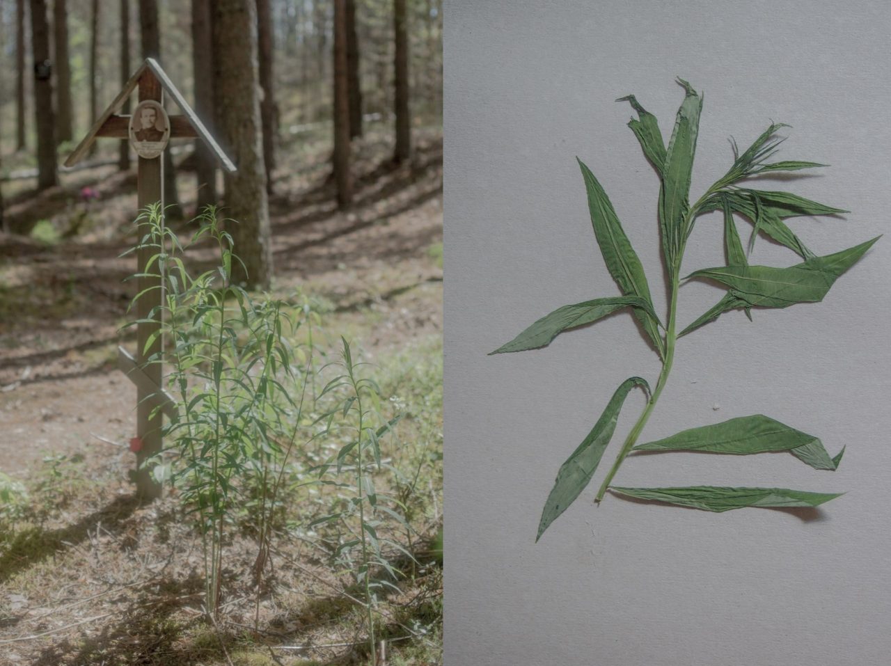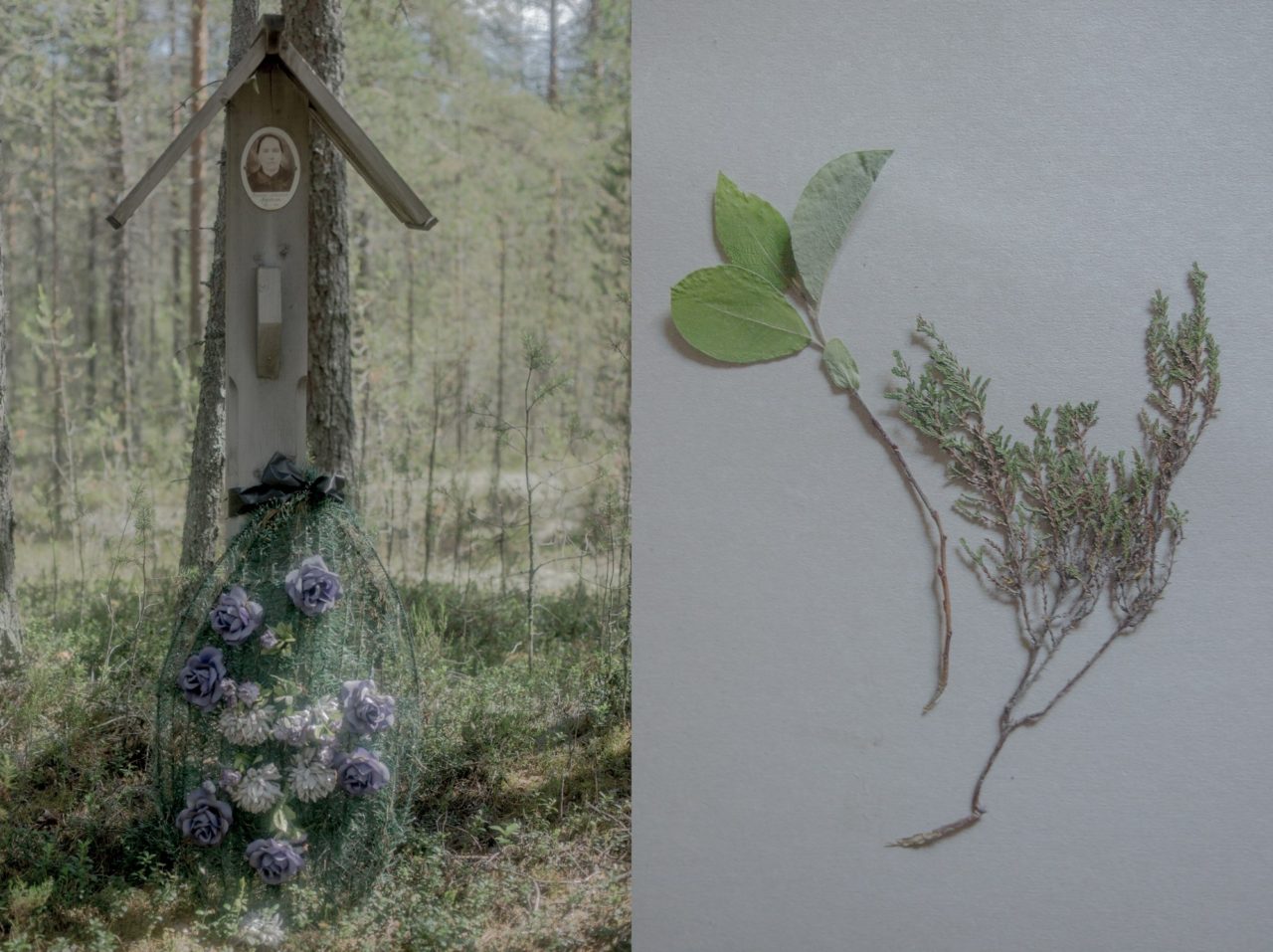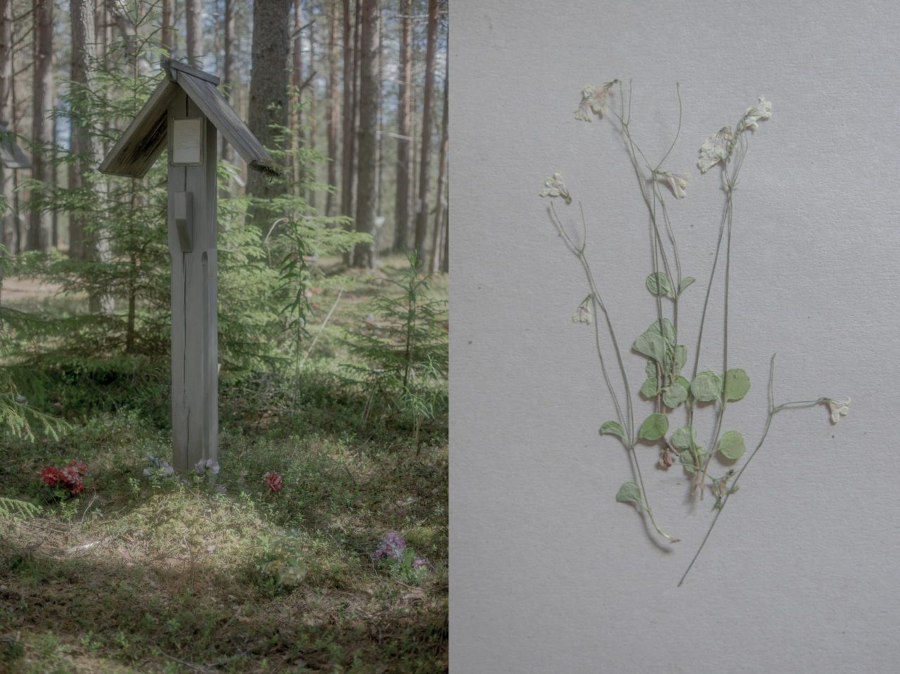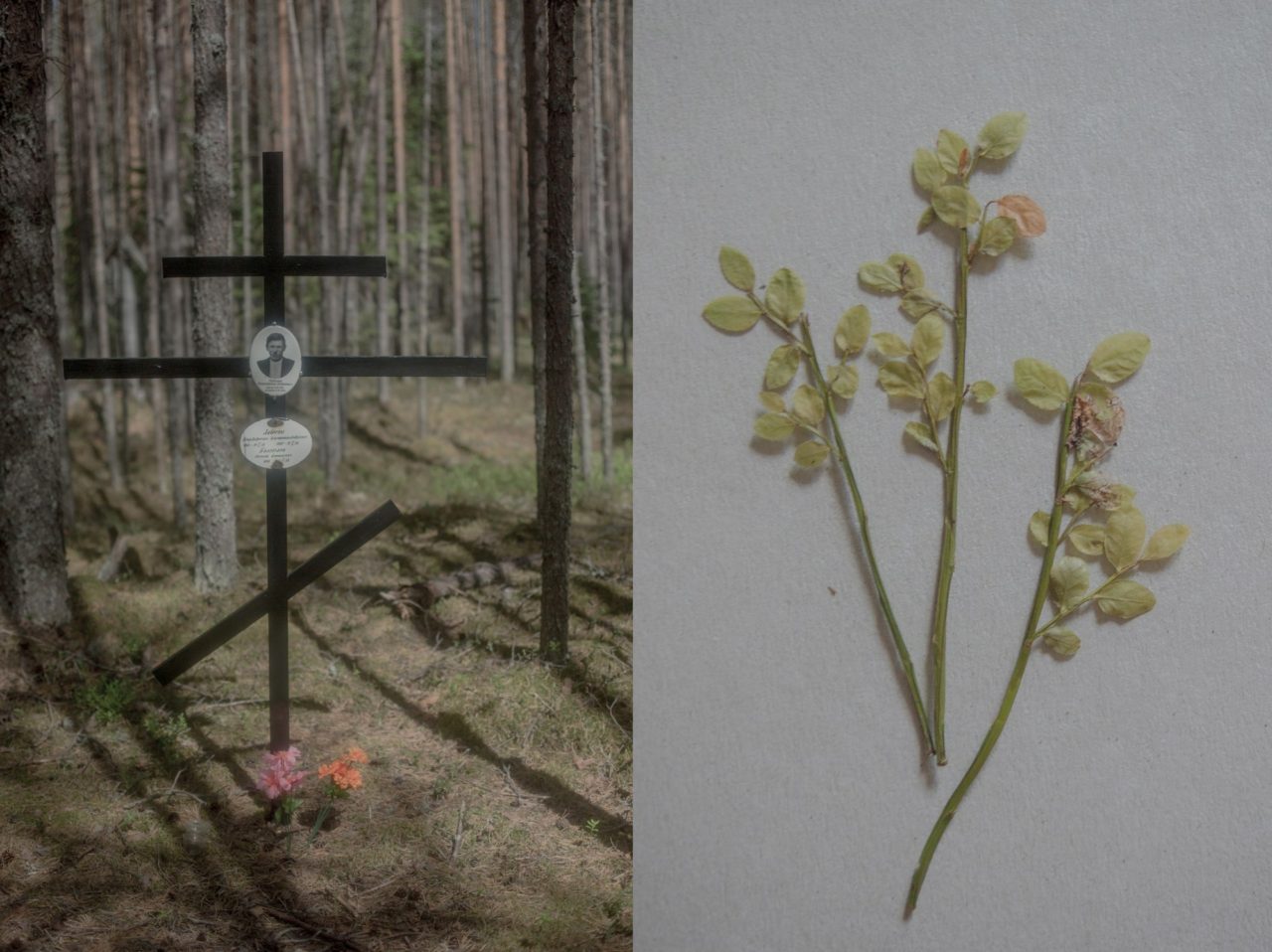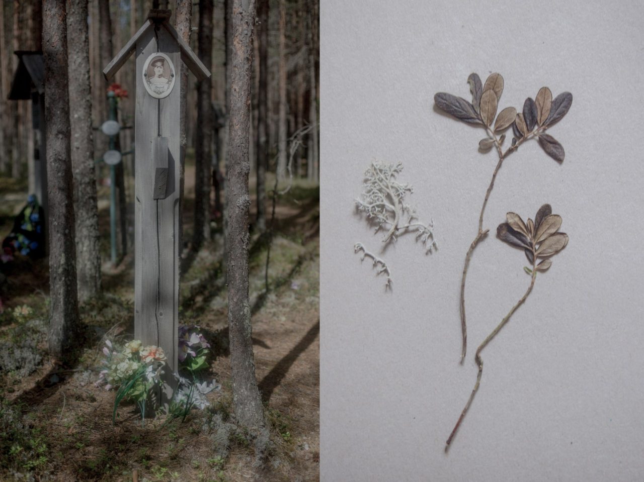 Урочище Сандармох. Слева: столб-голубец (распространенный на Севере вид памятного знака) Федора Павловича Багрова (1895—1937). Справа: растения, выросшие у поклонного креста
