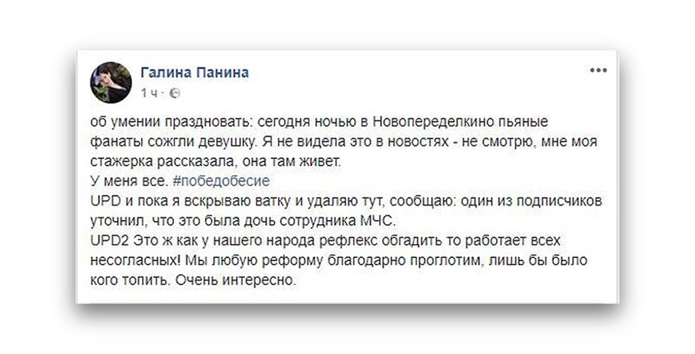 2 июля PR-директор компании «Леруа Мерлен» Галина Панина опубликовала в своем фейсбуке пост, рассказывающий об «умении» футбольных болельщиков «праздновать победы». «Сегодня ночью в Новопеределкино пьяные фанаты сожгли девушку. Я не видела это в новостях — не смотрю, мне моя стажерка рассказала, она там живет», — говорилось в посте.